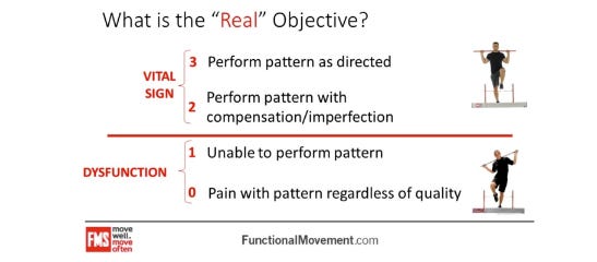 The 7 movement screens from the FMS are predicated on several concepts borrowed from other researchers and medical practitioners, such as Vladimir Janda. Janda began challenging traditional structural approaches to dysfunction and pain in the mid 1900s, which focused exclusively on the site of discomfort (Page et al., 2010). During this time, Janda submitted that a different paradigm was necessary to fully comprehend the nature of pain; he suggested embracing a functional approach, whose purpose was to uncover the source and cause of pain through observation of the sensorimotor system, motion, and basic movement patterns (Page et al., 2010). Similar to Janda’s approach, the FMS recognized dysfunctional movement patterns as a representation and consequence of poor motor control and muscle imbalances, considered the progenitors of pain (Cook et al., 2014). Ultimately the authors’ goals were to create a screening process that would: identify individuals at risk of injury, assist in developing corrective exercise to fix impaired movement patterns, provide a tool to systematically track progress and change, and to create a functional baseline that would allow a rating system of dysfunctional movement patterns (Cook et al., 2014).