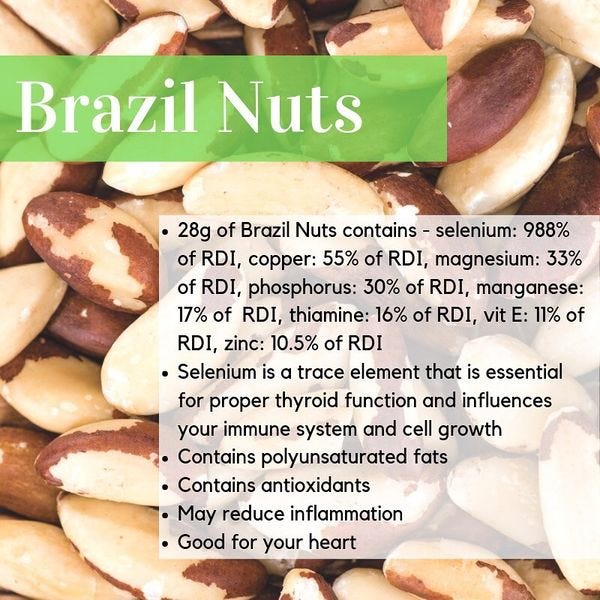 In conclusion, evidence has supported the positive impact of specific foods on Se levels and anti-oxidant activity. Most relevantly, the research of Stockler-Pintos et al. (2010) emphasized the impact of Brazil nut consumption in rectifying Se deficiency; a modicum of said nut (i.e., one nut/day) for 3 months demonstrated a positive and measurable change in biomarkers central to maintaining optimal Se levels. Finally, the study is a reminder of the influence of food as a first line intervention (i.e., food-first approach) in addressing health-related matters in a safe and cost-effective manner.